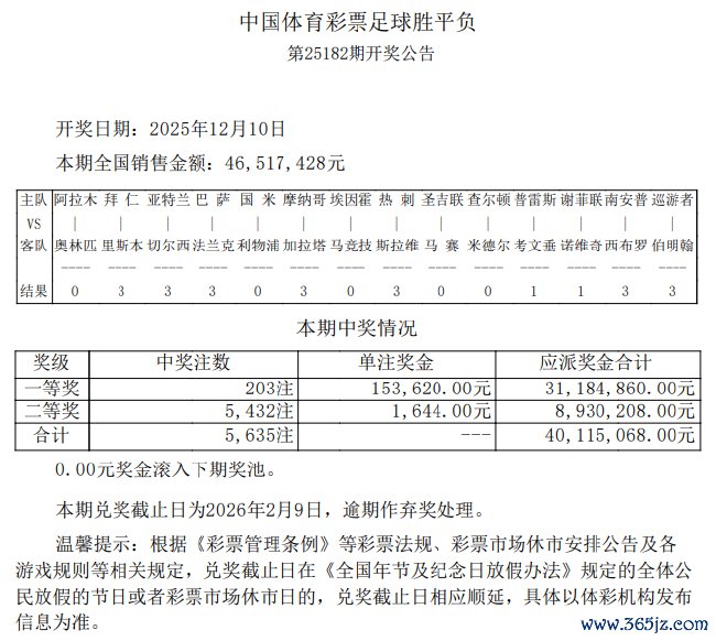 北京时辰12月10日,赢输彩第25182期开奖效果揭晓。本期足彩头奖开出203注,单注奖金153,620元,1034万滚存被清空;二等奖开出5432注1644元;任九开21,578注639元。本期赢输彩销量为46,517,428元,任九投注总数为21,545,870元。