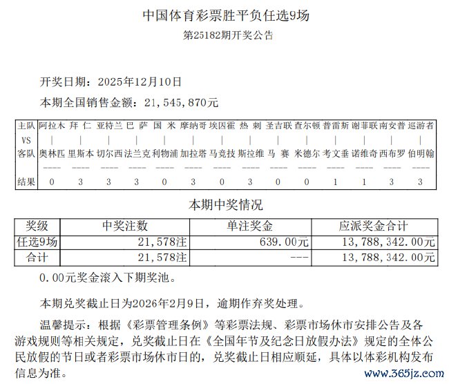 北京本事12月10日,输赢彩第25182期任九开奖遵守揭晓。本期任九共开出21,578注,单注奖金639元。本期任九投注总和为21,545,870元。
